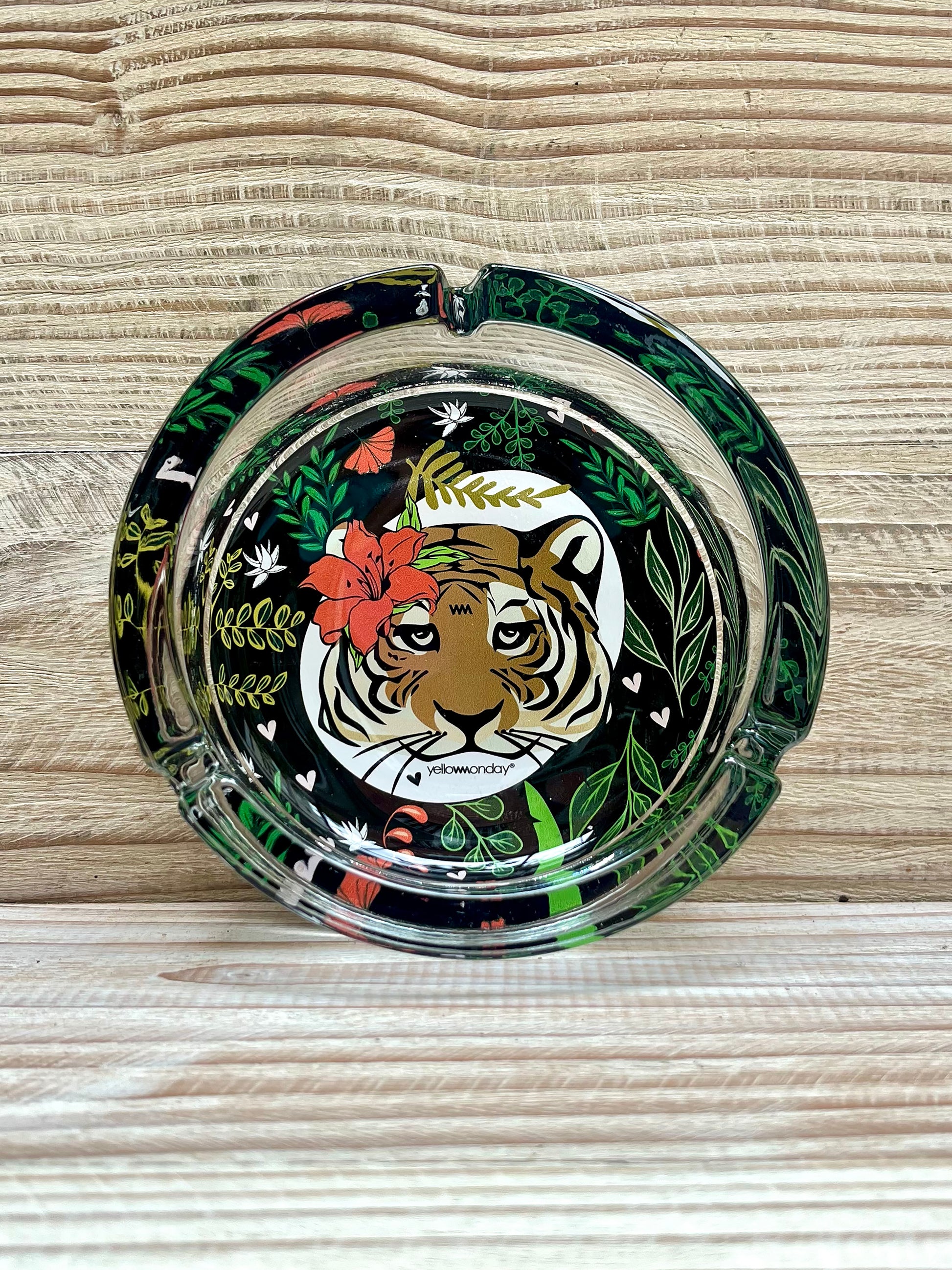 Cenicero de vidrio con adhesivo laminado.